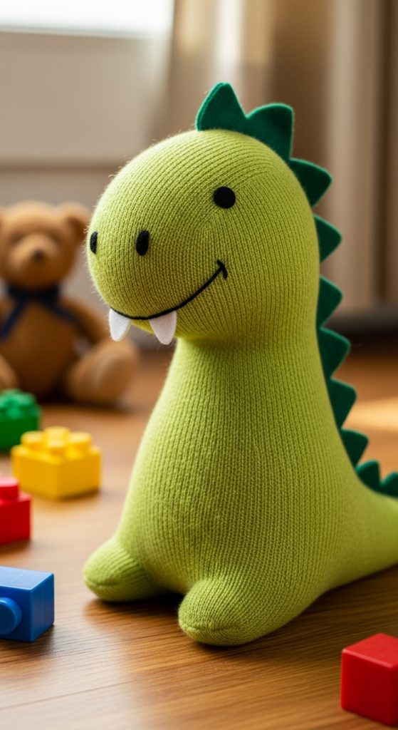 A sock dinosaur is a playful and imaginative project that children love. Choose a bright-colored sock for a fun look. Materials include stuffing, needle, thread, scissors, and felt for spikes.