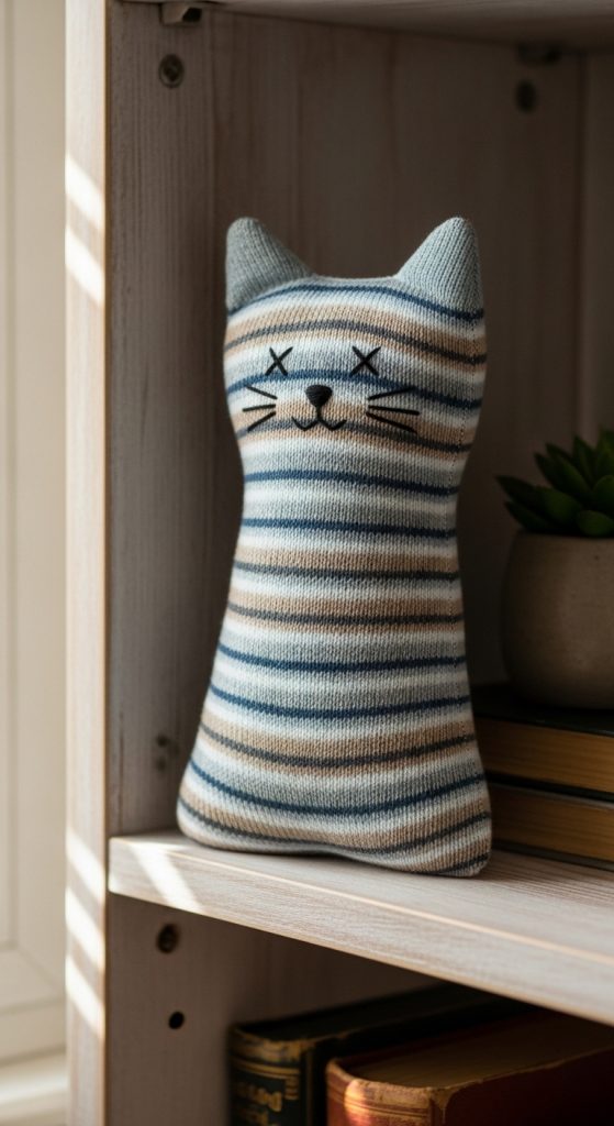 Add whiskers using embroidery thread and stitch small eyes and a nose. Sock cats are lightweight and soft, making them suitable for children and decorative use. You can create different cat expressions by changing eye shapes or adding accessories like bows. This project is quick and ideal for beginners who want a fast and satisfying result.
