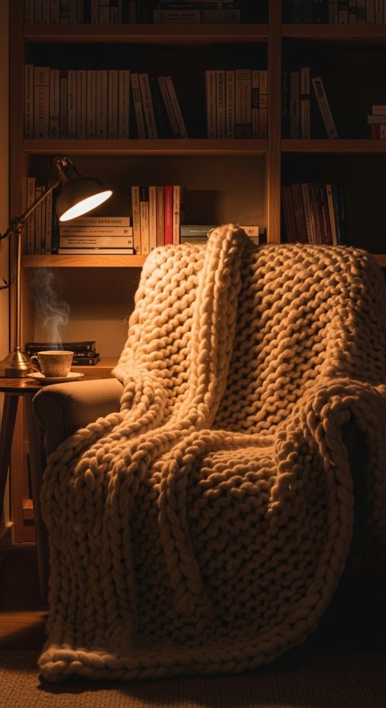 Made from wool, acrylic, or cotton blends, chunky knit blankets trap heat efficiently while remaining breathable. Their tactile structure makes them perfect for draping over a sofa arm or the end of a bed as a decorative accent. The weight of the blanket also gives a sense of calm and security similar to a weighted blanket.
