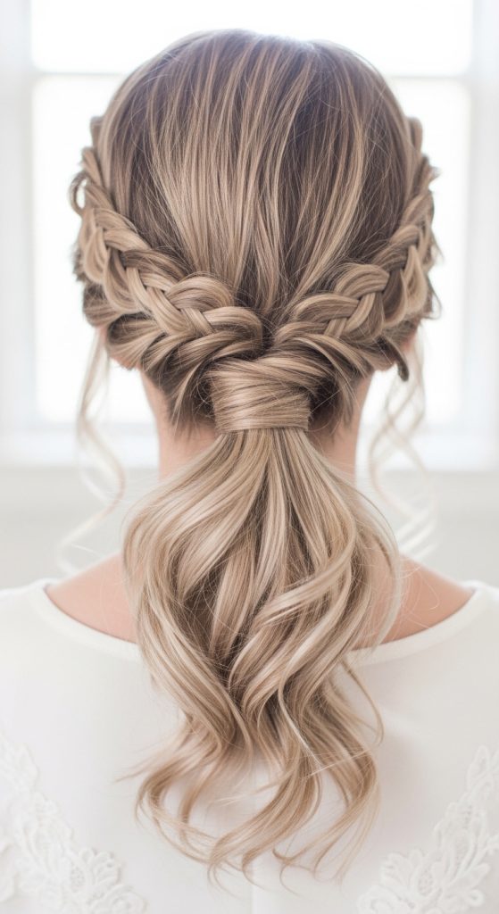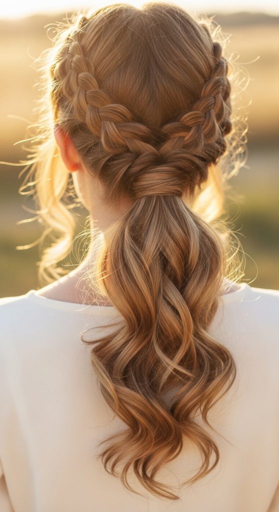 This variation integrates crown braiding before merging into a ponytail. It creates a halo-like structure.