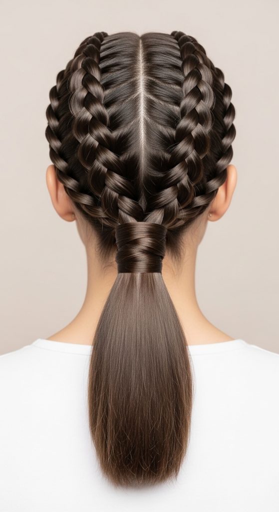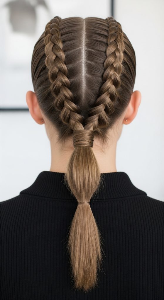 Preparation begins with clean and detangled hair, as smooth hair allows for more defined braids and a polished ponytail base. It is important to plan the parting style beforehand, whether center or side, because it influences the overall symmetry of the final look. Lightly sectioning the hair into two equal parts ensures balance in the braiding process. Planning also includes deciding the ponytail height, such as low, mid, or high placement, depending on the intended aesthetic. This preparation stage is crucial because it sets the foundation for a structured and visually appealing result that aligns with modern Pinterest inspiration and creative hairstyle ideas.