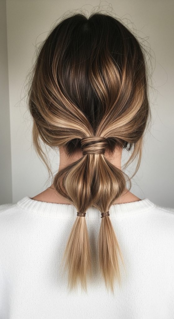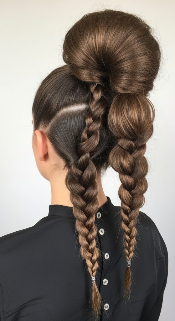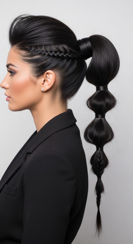 The bubble braid two ponytail fusion combines structured braiding with segmented bubble styling, creating a modern and playful aesthetic. This hairstyle is widely featured in Pinterest ideas due to its creative appearance and visual texture. It blends traditional braiding techniques with elastic-based sections that form โ€œbubbleโ€ shapes along the ponytail. This variation is ideal for individuals seeking a unique yet simple DIY hairstyle that stands out.