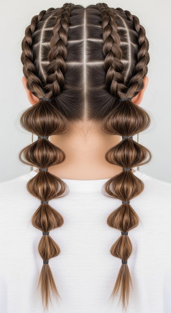 To create this style, start by dividing the hair into two equal sections and braiding each section partially or fully depending on preference. Once secured into a ponytail, add evenly spaced hair ties along each braid to form bubble sections. Gently pull each section outward to create volume. This method is simple, beginner friendly, and requires minimal tools while delivering a visually engaging result.