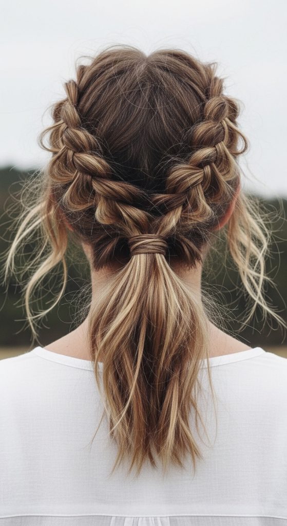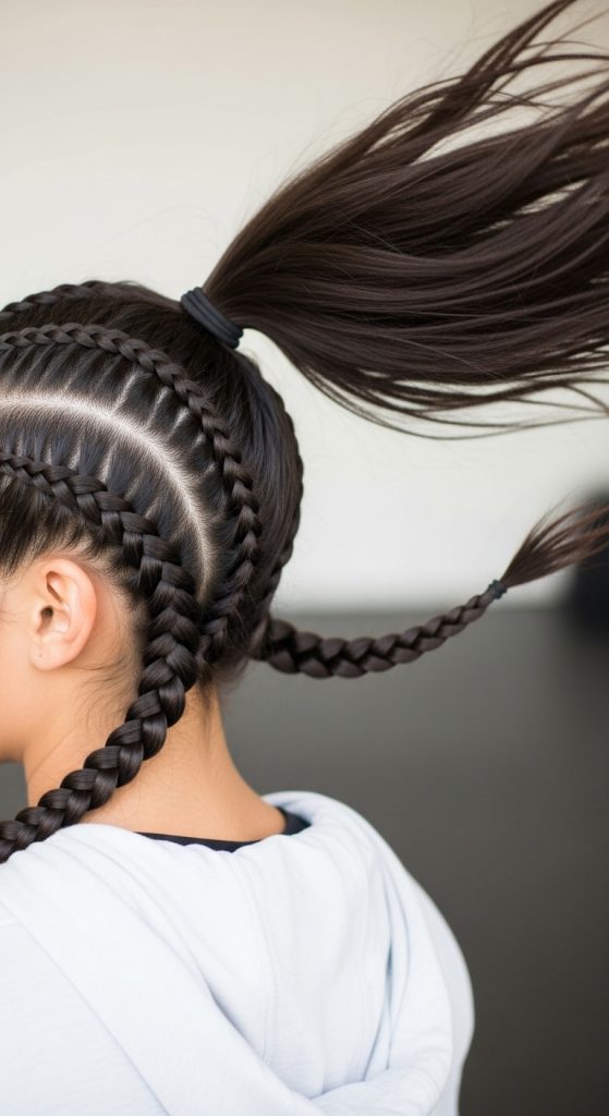 To enhance execution, small styling adjustments can be made based on hair type. For thicker hair, tighter braiding ensures better hold, while finer hair may benefit from slightly looser braids for added volume. The ponytail position can also be adjusted to suit preference, whether low for a minimalist style or mid-height for a more energetic look. This variation remains highly practical and widely used because it combines simplicity with adaptability, making it suitable for everyday routines and creative inspiration boards focused on easy yet aesthetic hairstyles.