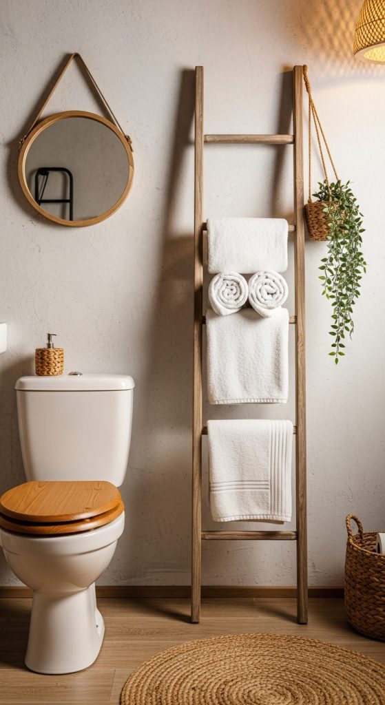Lean a decorative ladder against the wall above and behind the toilet to add height and function to the bathroom. These ladders provide space to drape towels, hang baskets, or display lightweight decor items.