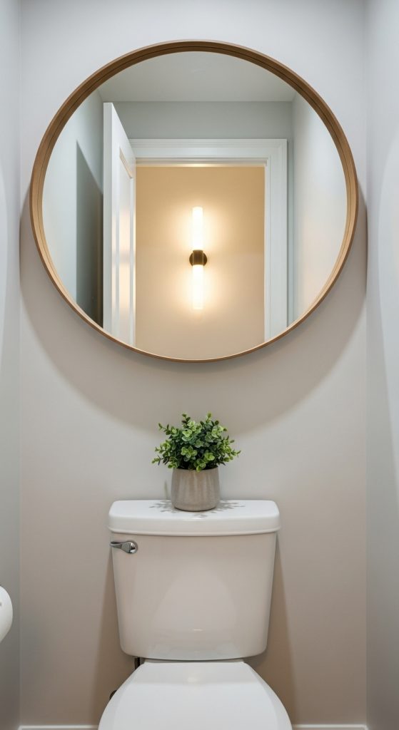 Mirrors are not only functional but also excellent for visually expanding a small bathroom. A decorative mirror above the toilet reflects light and makes the space feel larger.