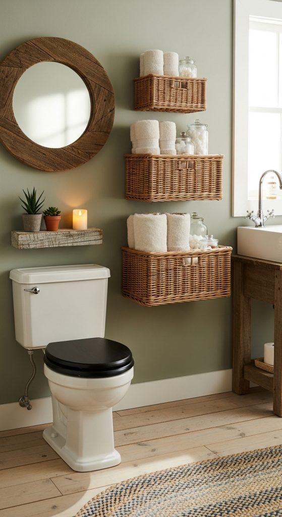 Wall-mounted baskets are both practical and stylish. They add a unique textural element while providing storage for items like rolled towels, toilet paper, or magazines.