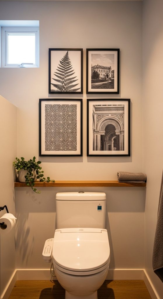 If you enjoy displaying art and photography, a gallery wall above the toilet is an eye-catching option. This approach transforms a plain wall into a creative display of your personality.
