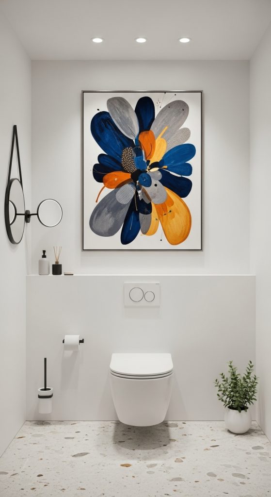 Hanging artwork above the toilet can turn a plain wall into a design feature. A large framed print or a set of smaller artworks creates visual interest and adds personality to the bathroom.