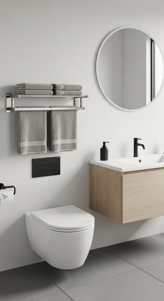 Installing a towel rack or set of hooks above the toilet combines functionality with style. This setup is especially useful in bathrooms with limited wall space.
