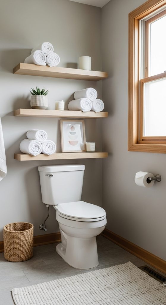 Floating shelves are one of the most versatile decor options for above the toilet. They provide both style and function, offering space for storage as well as decorative accents. Wooden shelves add warmth and rustic charm, while sleek white or black shelves can suit modern or minimalist bathrooms.