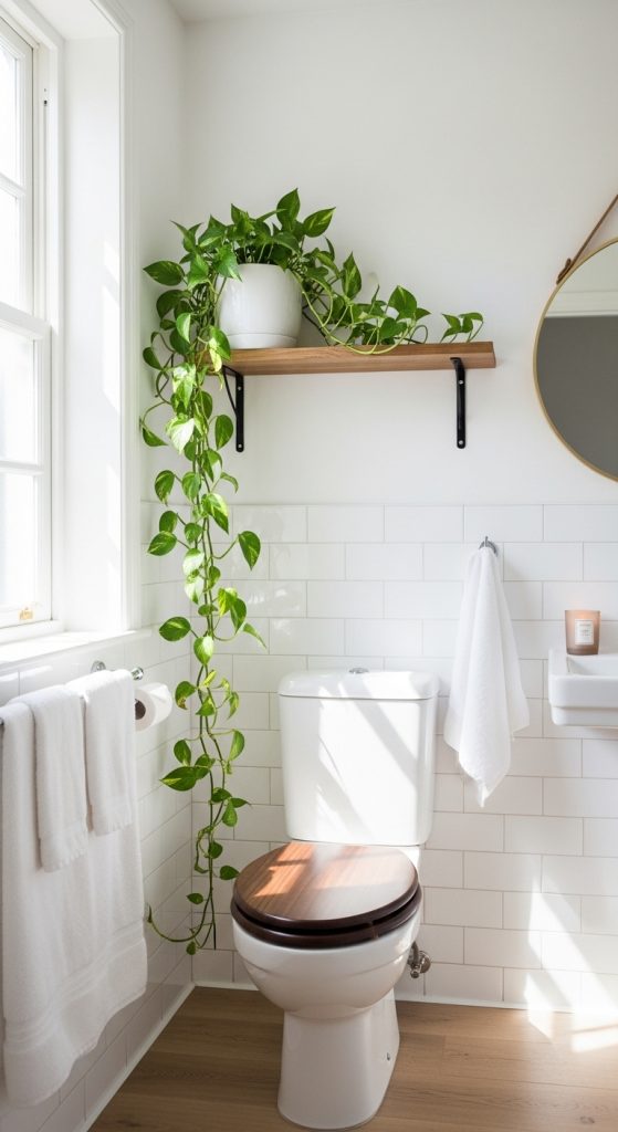 Adding greenery above the toilet instantly brings freshness and life to the bathroom. Plants soften hard surfaces, purify the air, and create a calming environment.