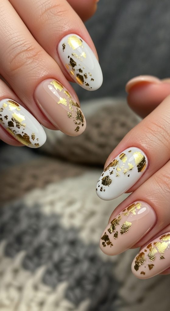 Apply a base color and then use nail foil adhesive to attach small foil pieces. Gold, silver, or holographic foils can be placed randomly for an artistic effect. Seal the design with a clear top coat.