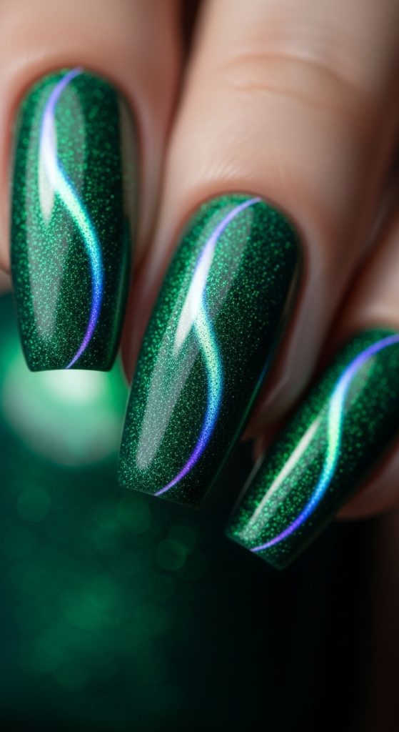 These nails look rich, dimensional, and perfect under party lighting. They work beautifully in dark shades like emerald, burgundy, or navy blue.