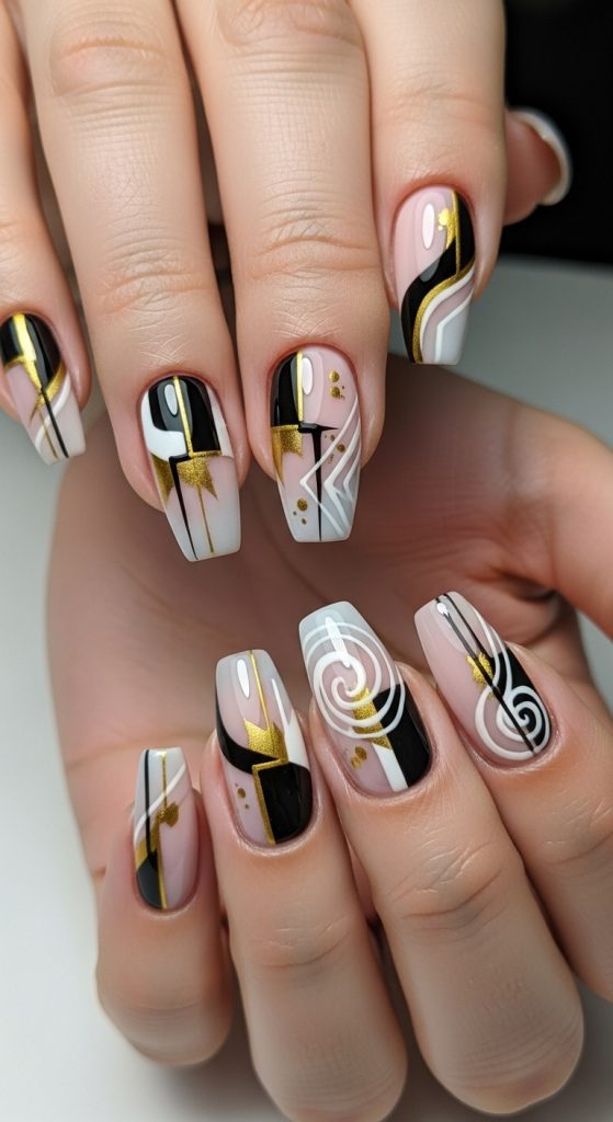 Use a neutral base color, then paint or draw irregular shapes and lines using contrasting shades such as black, gold, white, or red. Each nail can feature a unique pattern while maintaining a cohesive color theme.