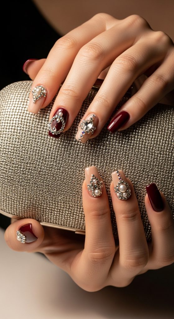 Start with a solid color base like deep red, black, or nude. Using nail glue, apply rhinestones, pearls, or small studs strategically to create patterns or accents. Finish with a clear top coat to secure the jewels.