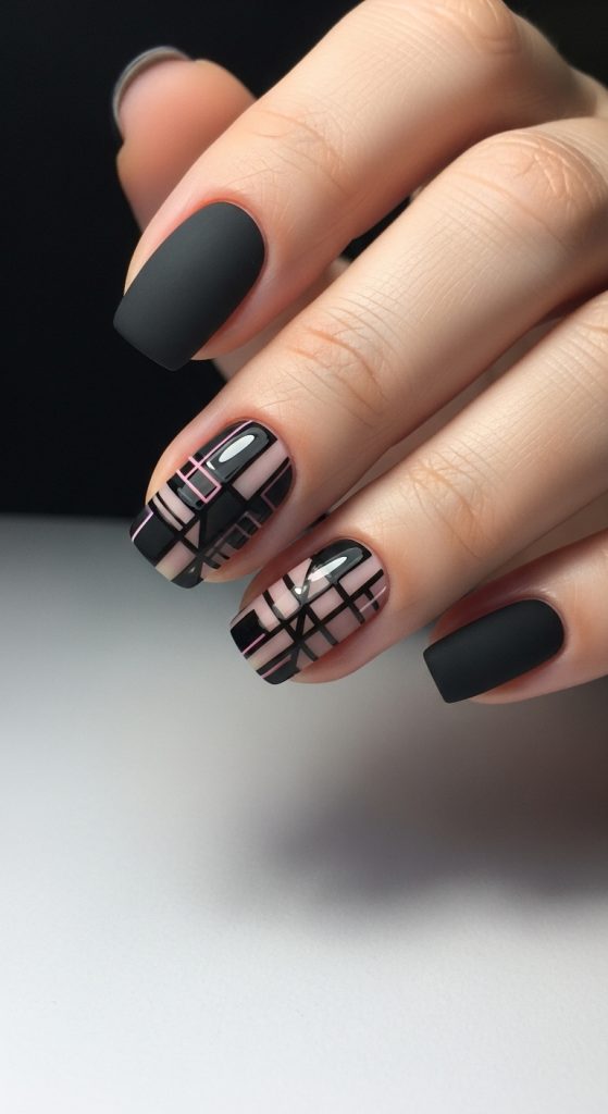 Black matte nails with glossy stripes are timeless and dramatic, while nude tones give a softer, minimalist feel.