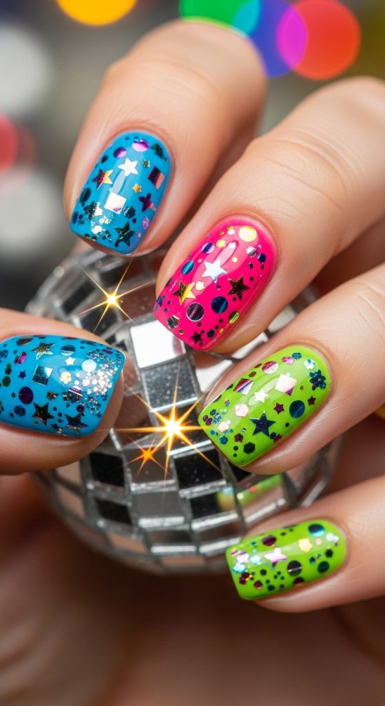 The shiny foil pieces catch the light beautifully, making your nails sparkle effortlessly at any party.
