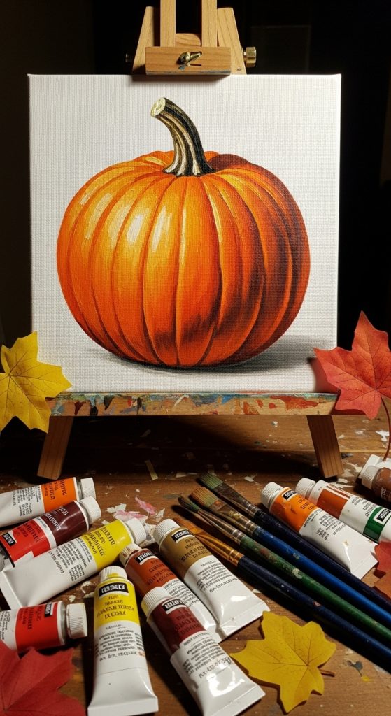 For a more traditional artistic approach, create a still life composition featuring pumpkins surrounded by autumn elements. Place a few pumpkins of different sizes on a table and paint them from observation or a reference photo. Include fallen leaves, acorns, pinecones, or a rustic wooden crate.