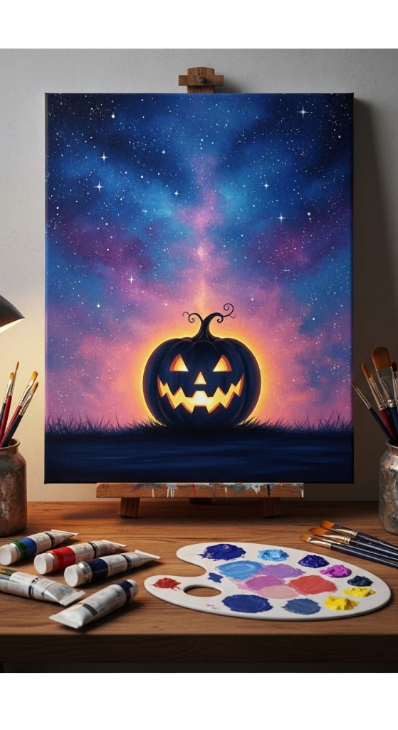 Blend the magic of autumn with a cosmic twist. Paint your canvas background as a galaxy with deep blues, purples, and hints of pink. Add stars and small specks of white paint for a celestial effect. In the foreground, paint a pumpkin silhouette glowing with soft golden light, as if illuminated by the stars.