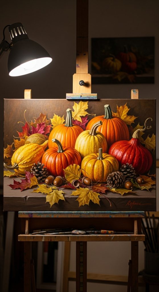 Use warm tones like burnt orange, brown, gold, and deep red to convey the richness of the season. Focus on light and shadow to add realism. This classic style works beautifully for living rooms, dining areas, or art collections inspired by nature.
