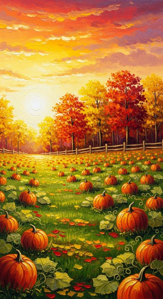 Capture the feeling of a crisp autumn day with a pumpkin patch landscape painting. Start with a blue sky fading into warm sunset hues like orange, pink, and purple. Add a row of pumpkins scattered across a field of green or brown earth. Include trees with golden leaves or a rustic wooden fence in the background.