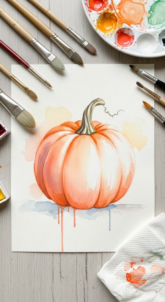Add splashes or drips around the edges for an artistic touch. This loose and flowing technique is perfect for creating modern seasonal wall art. Watercolor pumpkin paintings look especially beautiful in sets of two or three with coordinating colors.